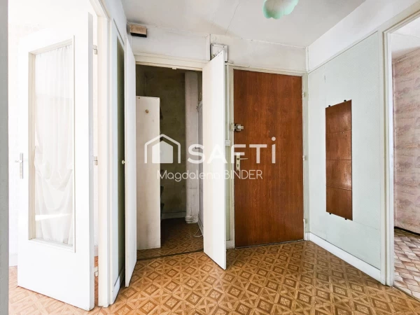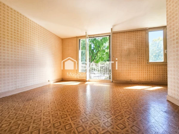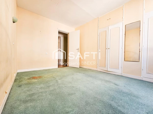Dans un petit immeuble, au 1er étage (sans ascenseur), appartement traversant comprenant : une entrée avec cellier, un double séjour (avec possibilité d’aménager une 3? chambre), une cuisine séparée, deux chambres, une salle de bains et des toilettes indépendantes.